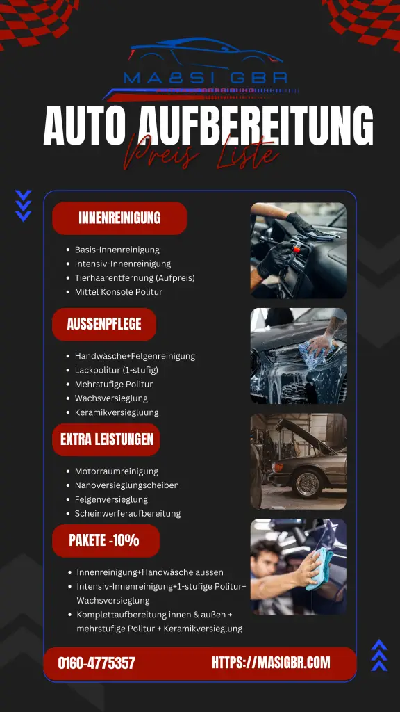 Hier erfahren Sie mehr über unsere Spezialdienste für Ihr Fahrzeug. Wir bieten Ihnen alles, was Sie für eine professionelle Fahrzeugaufbereitung benötigen. Vertrauen Sie auf unsere langjährige Expertise und lassen Sie Ihr Auto in neuem Glanz erstrahlen.